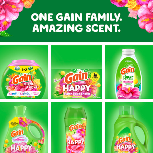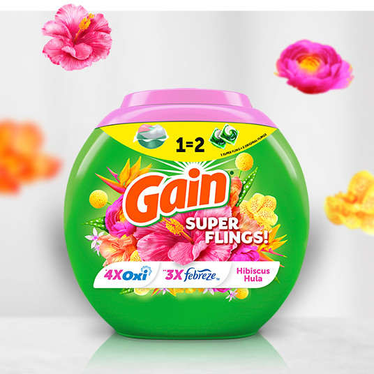 Send your nose on a play date with Gain Happy Super-Sized Flings Laundry Detergent. With twice the smile-inducing scent of regular Gain detergent, the fragrance will kick your cares to the curb the whole livelong day.