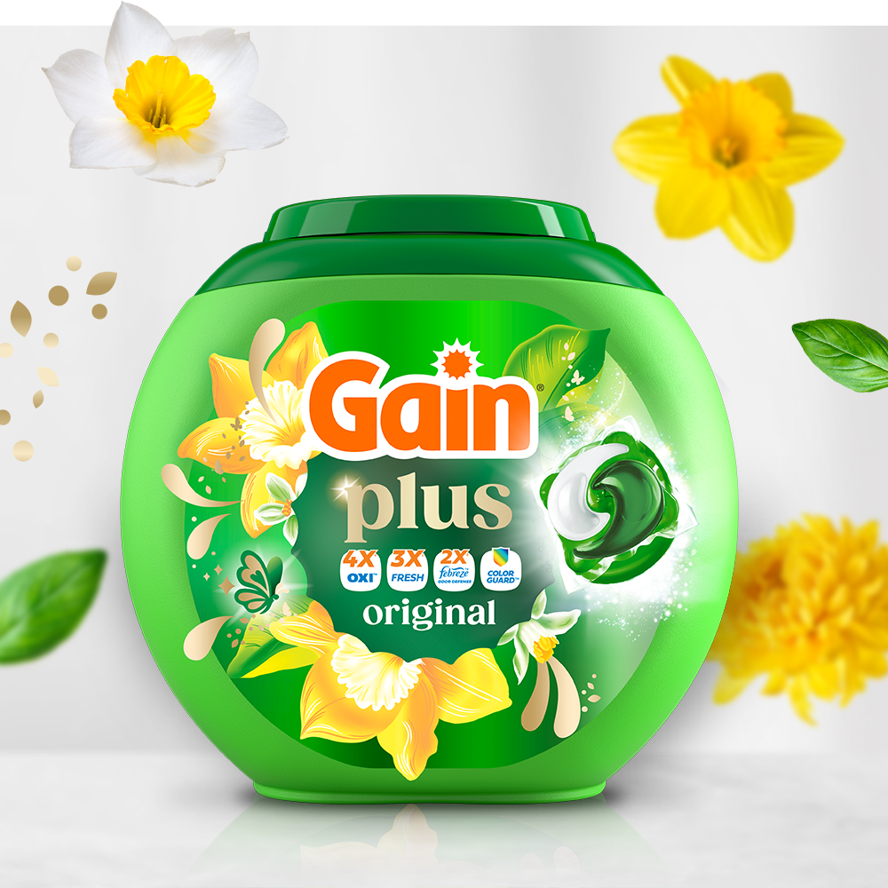 Gain Plus Flings detergent deliver Gain's best clean yet*, packed with even more Oxi, Freshness, and Febreze Odor Defense than Gain Classic. Delight in the vibrant blend of sun-kissed citrus and delicate florals for a scent that evokes a bright, blooming garden. Gain’s fragrance capsules provide all-day freshness, while its Odor Defense technology tackles tough, musty odors at their source. Fling’s Color Guard technology keeps clothes looking bright and vibrant. For best results, always add Flings to the empty drum before clothes. Complete your best smelling combo with Gain Scent Booster, Fabric Softener, Rinse, and Sheets.